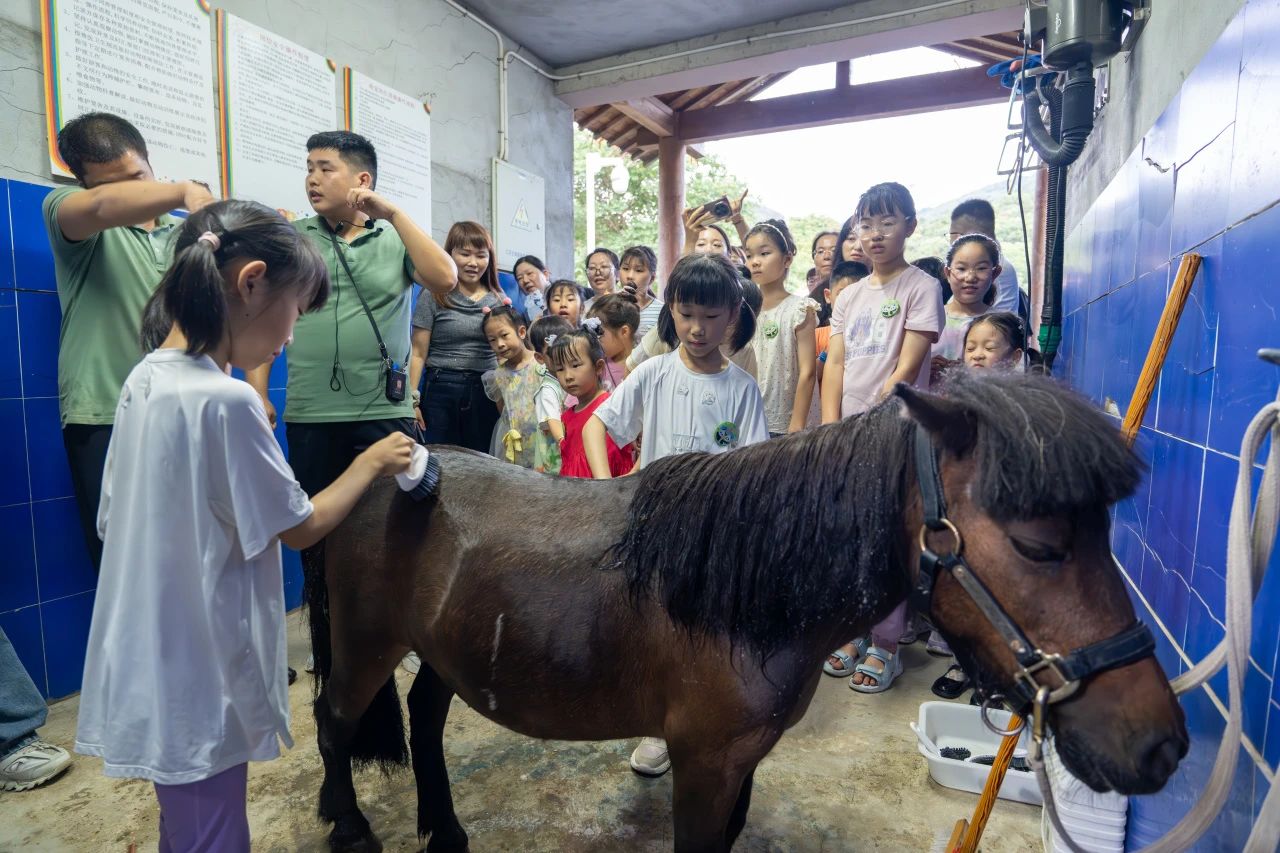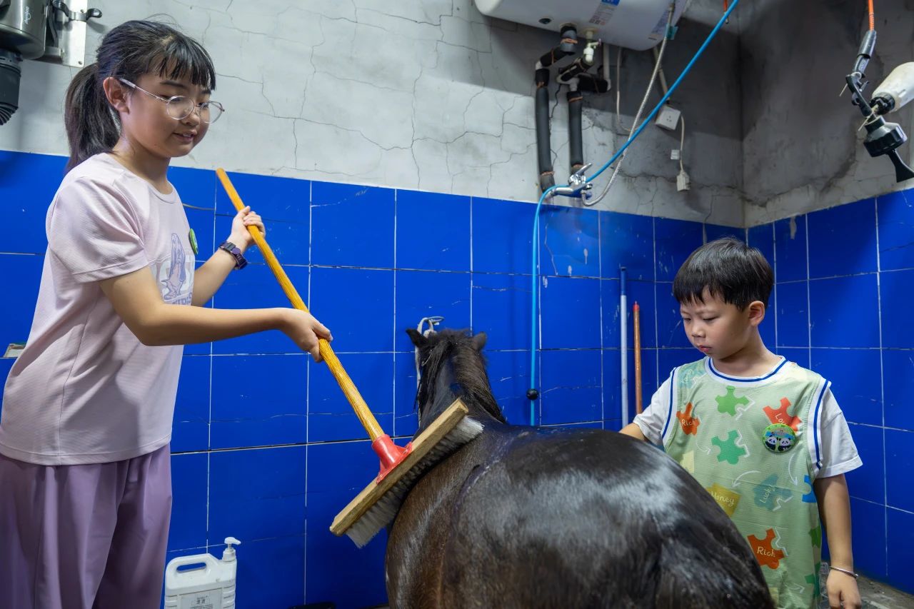在保育員指導(dǎo)下為矮馬沖涼、刷背,