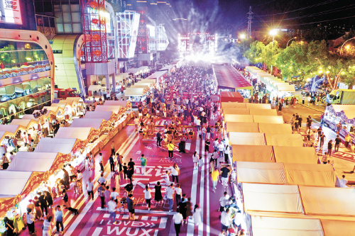 為有效把“蘇超”帶來的流量轉化為持久的經濟動能,無錫配合賽事,利用多個商場、景區、戶外廣場大屏進行直播,打造遍布全城的“第二現場”,與城市空間、消費場景深度融合。大東方百貨不僅設置了兩處大屏直播點,更推出“跟著蘇超游無錫”主題活動;無錫招商城打造“夏日星空夜市”,有“蘇超”的周末客流量達上萬人次;宜興“網紅夜市”蛟橋河步行街里,足球激情與地攤經濟碰撞出新火花……7—8月,中山路、長江路、太湖新城等多個市商務局重點監測商圈銷售額實現同比兩位數增長,其中中山路商圈單月增幅超20%。