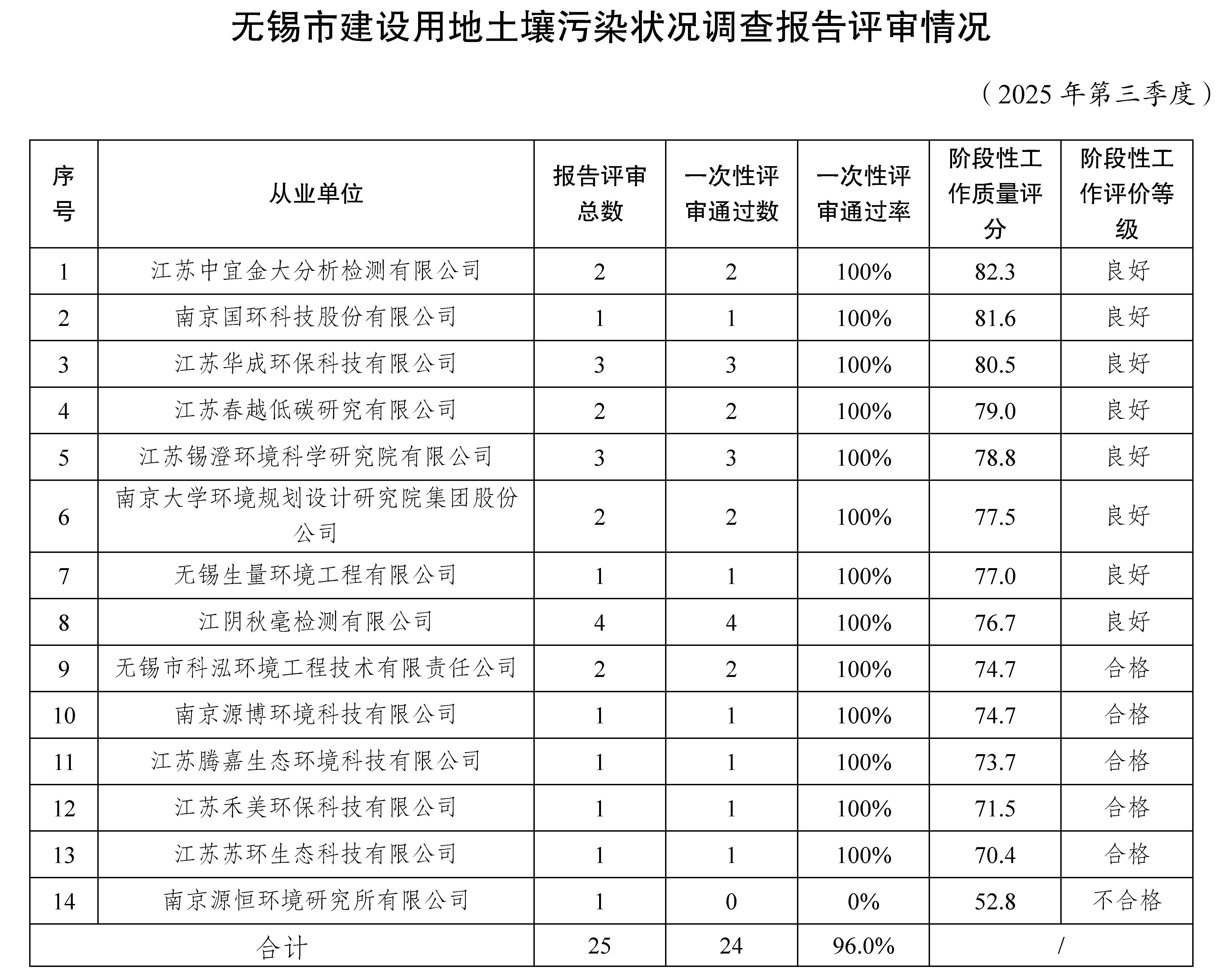 根據《無錫市建設用地土壤污染狀況調查從業單位工作質量評價辦法(試行)》,我局對全市2025年第三季度建設用地土壤污染狀況調查報告評審情況進行了匯總,相關情況公示如下: