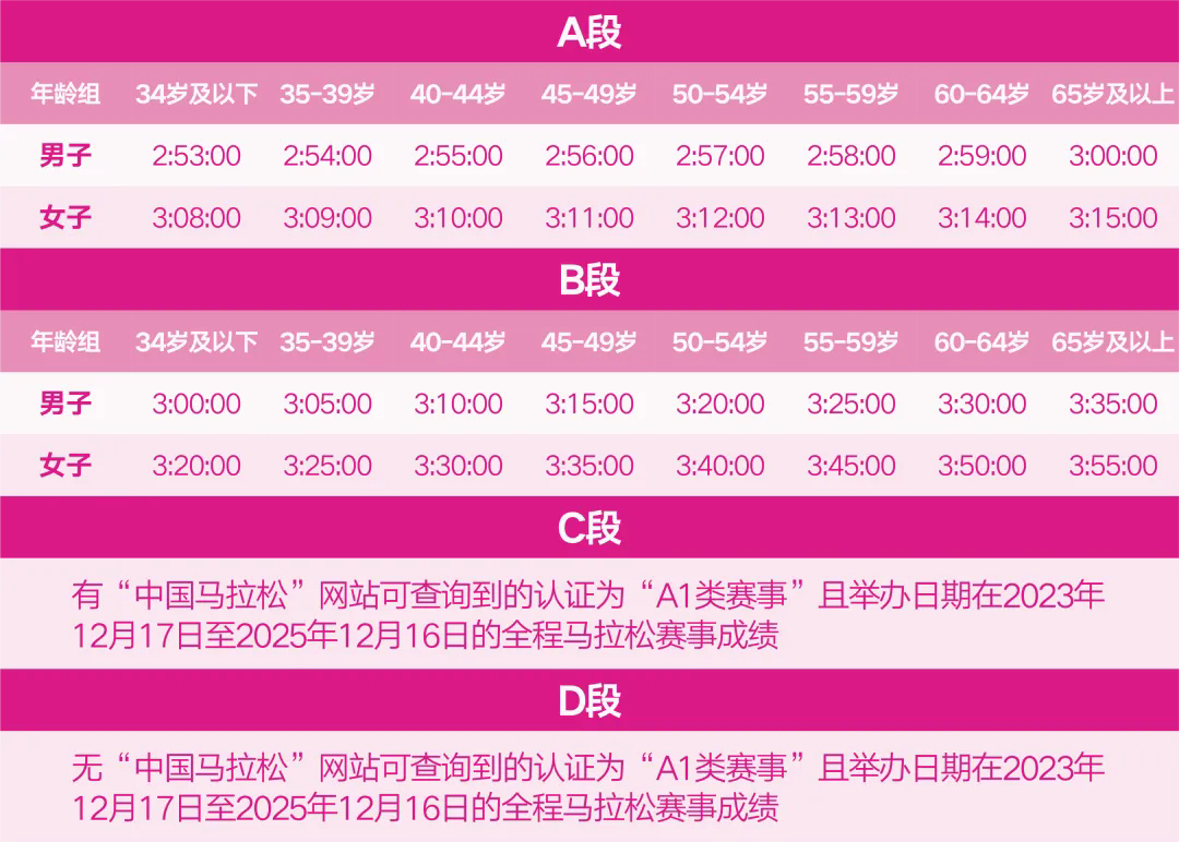所有報名馬拉松項目的選手,根據其“中國馬拉松”網站可查詢到的認證為“A1類賽事”且舉辦日期在2023年12月17日至2025年12月16日的賽事中,馬拉松項目最好成績達到如下成績標準的分別進入各抽簽段。