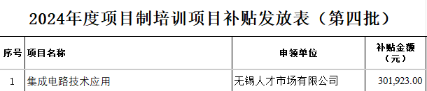 根據《市人力資源和社會保障局市財政局關于加強和改進政府補貼性職業技能培訓管理工作的通知》(錫人社發〔2023〕41號)精神,截至目前,2024年度項目制培訓集成電路技術應用項目完成結班,并通過第三方無錫華夏中誠會計師事務所(普通合伙)的審核。現根據第三方提交的項目《決算審核報告》進行補貼發放,發放情況如下: